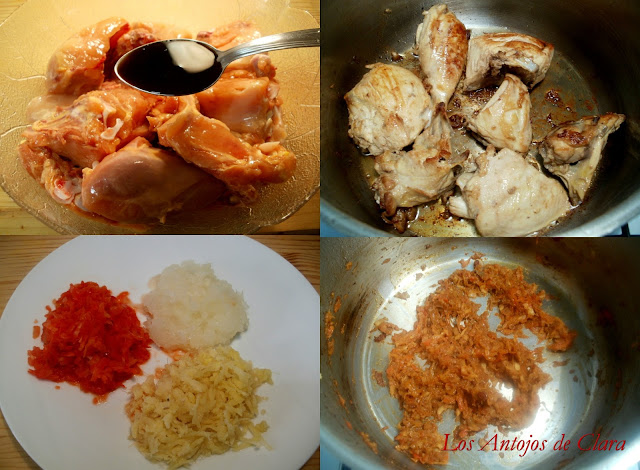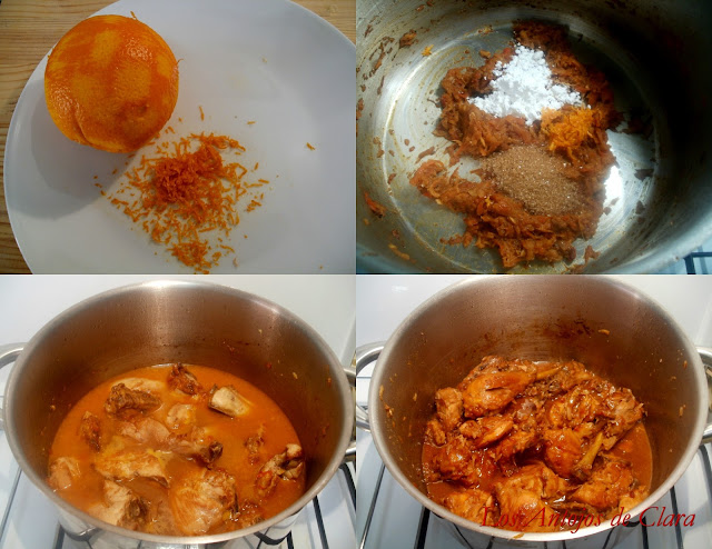 Colocamos el pollo troceado y limpio en un tazón grande y lo sazonamos con 2 cucharadas de salsa de soja. Removemos para que todos los trozos se impregnen bien con la salsa. En una olla grande calentamos las 3 cucharadas de aceite y freímos las piezas de pollo a fuego alto hasta que adquieran un color dorado. Yo las freí en varias tandas, no eché todos los trozos juntos para que no perdieran agua. Cuando terminemos de dorar todos los trozos, los sacamos de la olla y reservamos. En la misma olla sofreímos a fuego medio por 10 minutos el pimiento con la cebolla y el jengibre fresco. Cuando las verduras estén blandas, agregamos la ralladura de naranja, el azúcar moreno y la cucharadita de Maizena o harina de trigo. Removemos y seguimos rehogando. Volvemos a echar el pollo en la olla, vertemos el zumo de naranja y el agua y sazonamos con una cucharadita de sal.