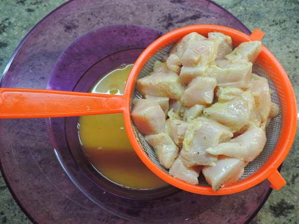 Lo sacamos y lo escurrimos bien, el caldo de macerar lo guardamos.