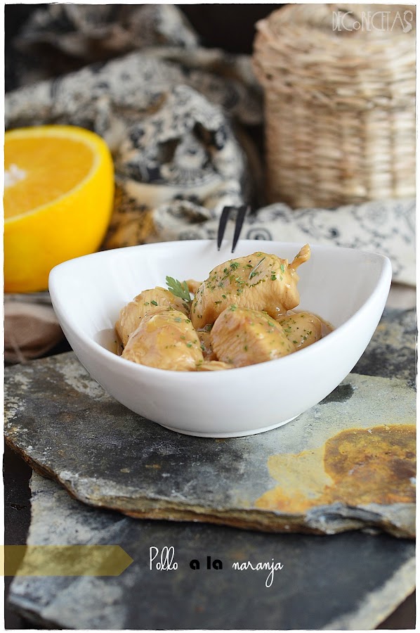 Para realizar la salsa necesitamos el zumo de una naranja, un diente de ajo machacado, 2 cucharadas de salsa de soja, una cucharadita de vinagr,e una cucharada de miel, una cucharada de maicena, una cayena y un chorro de vino blanco. Todos estos ingredientes los mezclamos y batimos bien y introducimos dentro de ellos el pollo cortado en taquitos dejando marinar al menos media hora Posteriormente en una cazuela pochamos una cebolla a la que añadimos la salsa con el pollo y dejamos reducir todo conjuntamente durante 20 minutos a fuego bajo