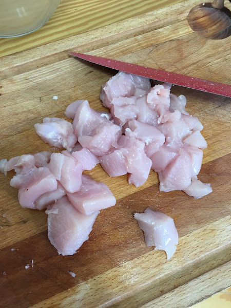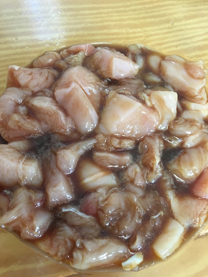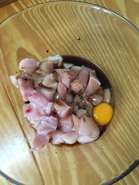 Cortamos las pechugas de pollo a dados. Las ponemos en un bol. Vertemos en el bol 4 cucharadas de salsa de soja, el licor de canela que tenemos y 1 huevo y lo mezclamos todo.