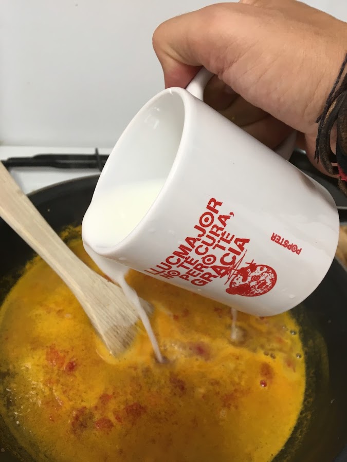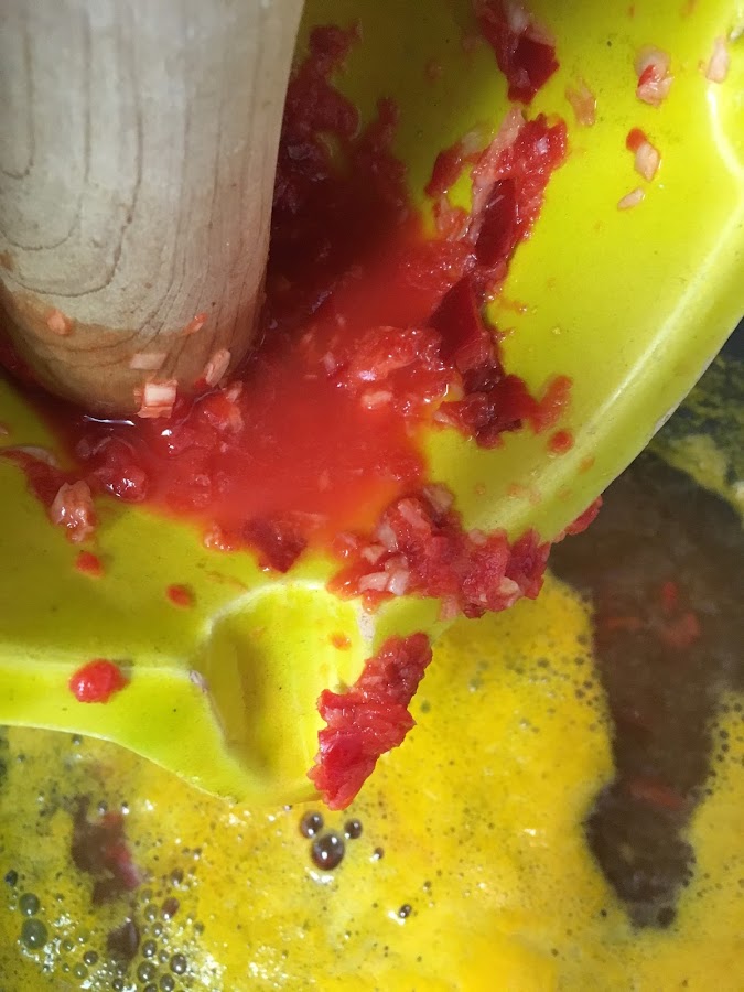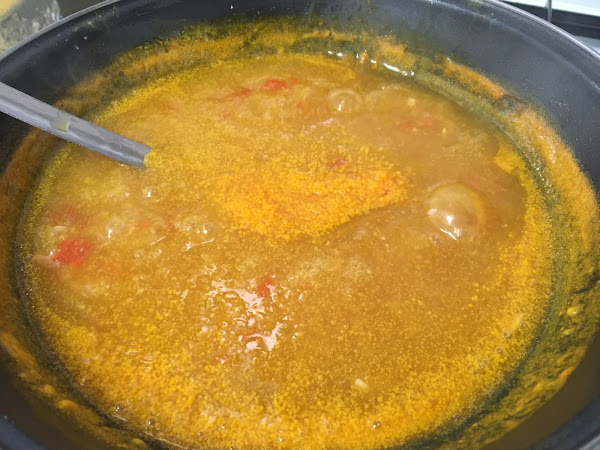 Lo mezclamos todo y cuando llegue al punto de ebullición le añadimos la pasta de pimiento rojo y removemos y lo dejamos hirviendo.