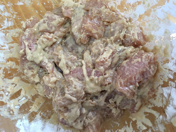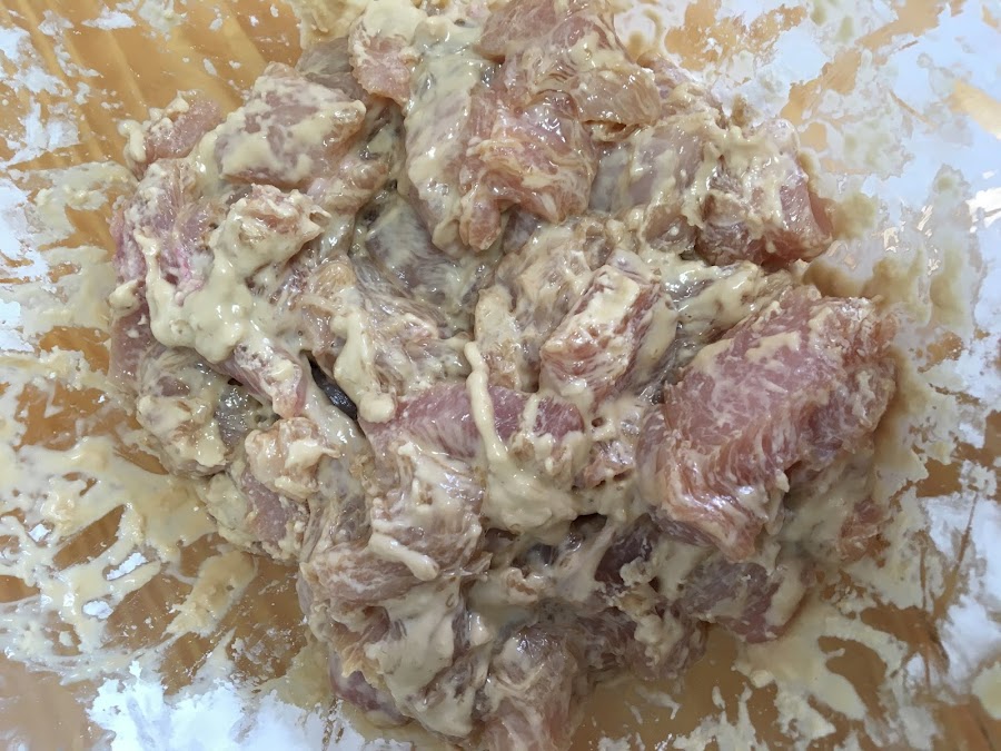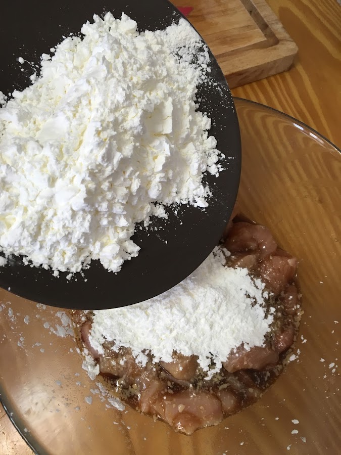 En el mismo bol donde tenemos el pollo marinando introduciremos la maicena y mezclaremos para que todos los trozos de pollo se impregnen y queden recubiertos.