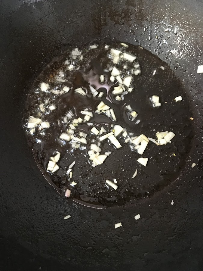 Retiramos el aceite del wok y en el mismo wok, ya sin aceite, ponemos 2 ajos picados y los tenemos al fuego hasta que se doren.