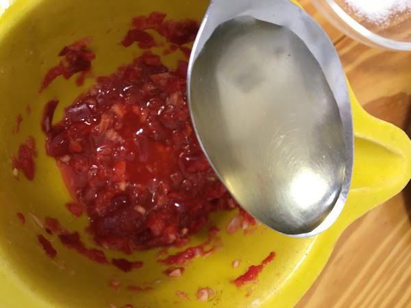 Con el mazo del mortero lo iremos chafando hasta que nos queden todos los ingredientes bien machacados y a modo de pasta humeda. Le añadimos una cucharada de vinagre de arroz y lo acabamos de machacar y mezclar.