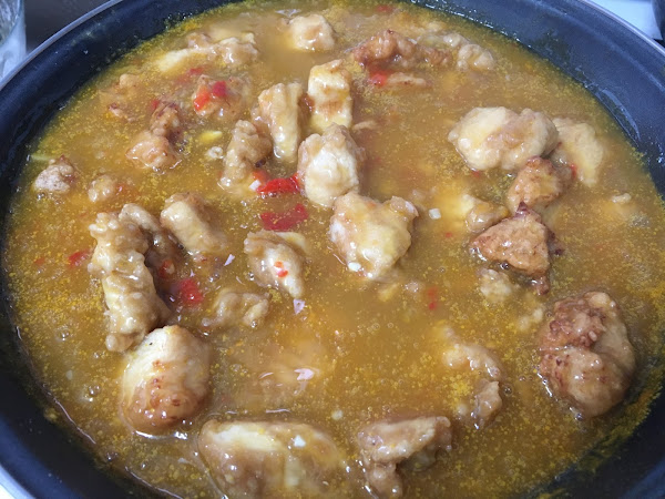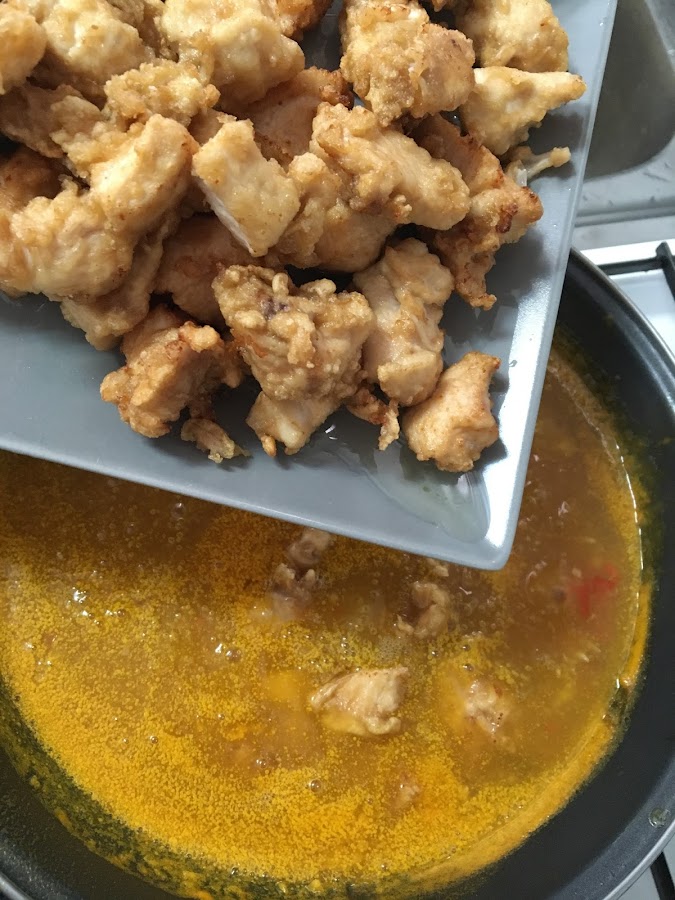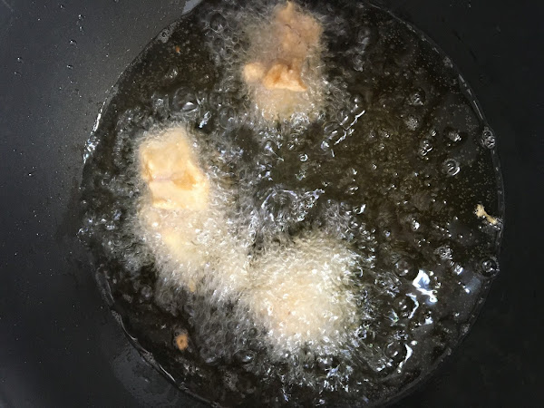 Acto seguido pondremos abundante aceite en un wok y cuando esté caliente iremos introduciendo y friendo los trozos de pollo.