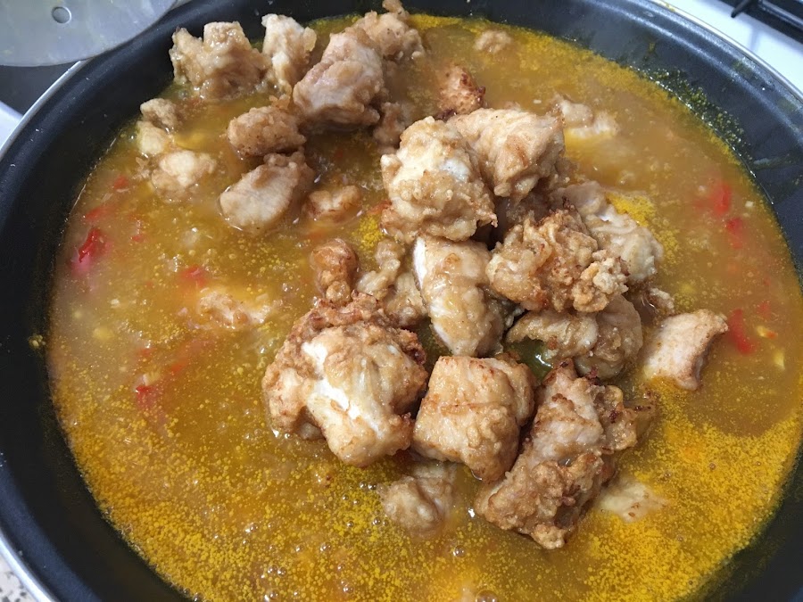 Debemos dejar que la salsa vuelva a hervir, momento en que le añadiremos los trozos de pollo que deben quedar totalmente cubiertos por la salsa.