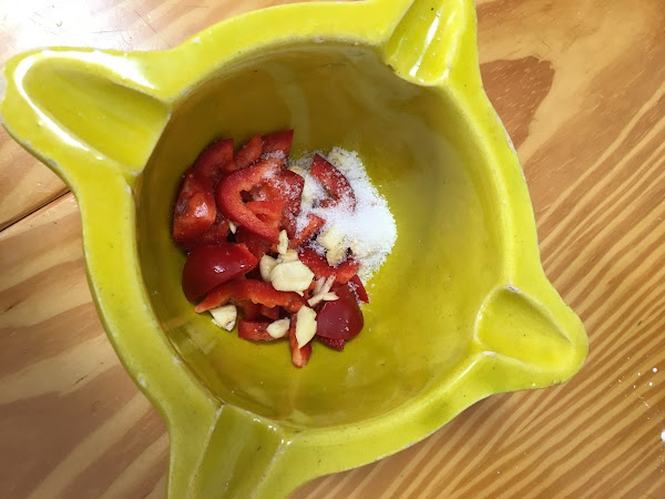 En un mortero pondremos 1/4 de pimiento rojo troceado, 2 ajos troceados y una pizca de sal.