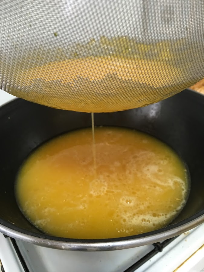 Cuando vemos que se han dorado, con ayuda de un colador para evitar que se nos cuele demasiada pulpa o alguna pepita, vertemos en el wok el zumo de naranja.
