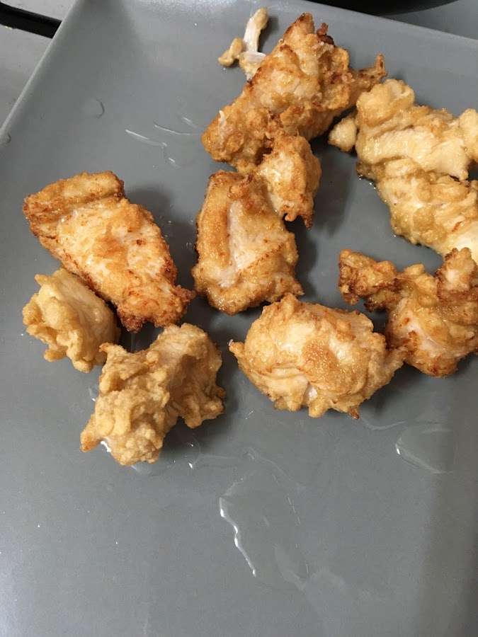 No podemos ponerlos todos de golpe porque nos saldría una masa de carne pegada. Debemos ir introduciendo de uno en uno los trozos de pollo, friendo y retirando por tandas. Los trozos estarán en el aceite durante 1 minuto (o no tanto). Debemos observar que el rebozado no nos coja un color muy tostado porque se nos va a quemar.