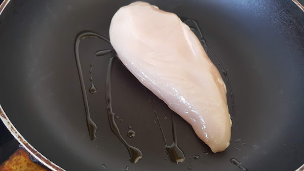 Añadimos la salsa y bajamos el fuego al mínimo. Dejamos que la salsa reduzca mientras se terminan de cocinas las pechugas.