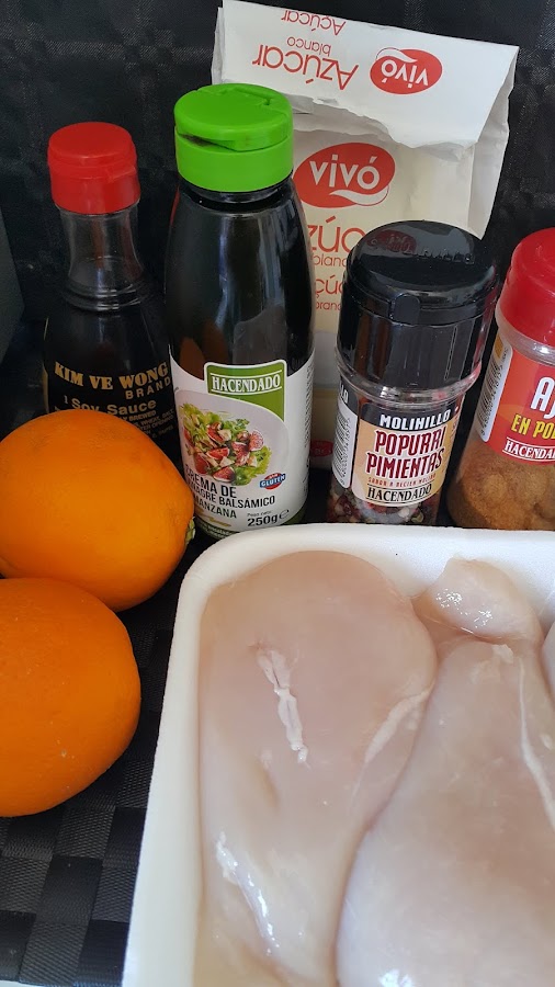 Hoy os traigo una receta de pollo a la naranja estilo restaurante chino. Empecemos con los ingredientes: