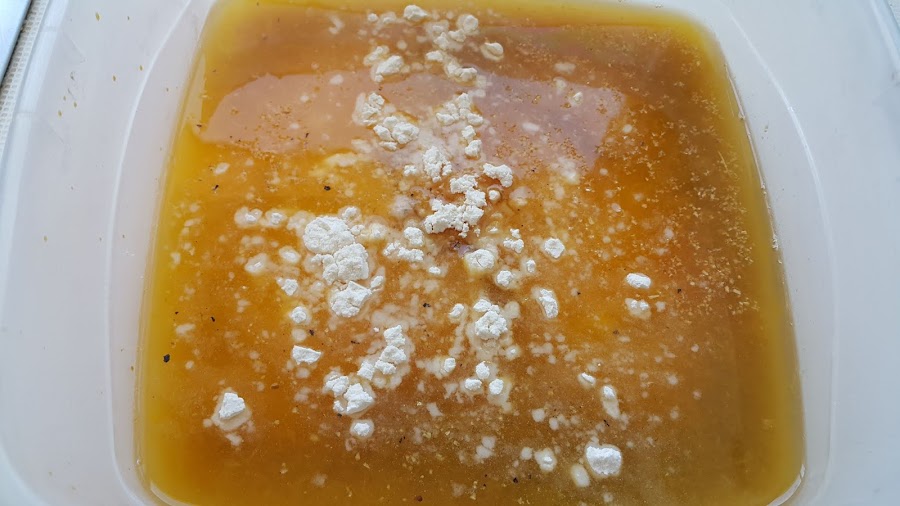 Añadimos al zumo: una cucharada de postre de salsa de soja, un chorrito de vinagre de manzana, una cucharadita de café de ajo en polvo, un poco de pimienta recién molida y una cucharada sopera de harina o maicena. Mezclamos todo bien y reservamos.