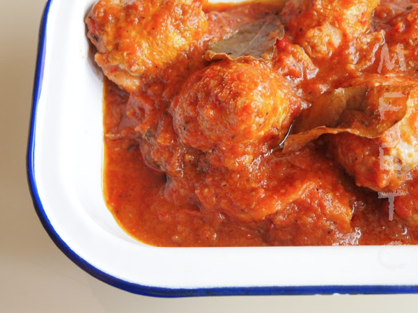6. Colocar los trozos de pollo dorados en un perol de fondo ancho con todos los aromas (romero, tomillo, laurel, pimienta...) echarle la salsa por encima, el caldo de pollo y agua hasta que cubra. Tapar y cocer a fuego lento de 45 minutos a 1 hora aproximadamente removiendo de cuando en cuando.