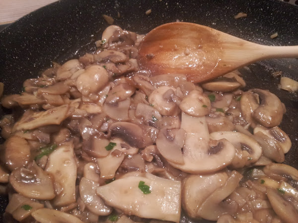 Los champiñones al ajillo: troceamos los dientes de ajo y los freímos ligeramente en una sartén con un par de cucharadas de aceite. Añadimos los champiñones (lavados, escurridos y secados con un paño húmedo) y los salteamos unos minutos. Incorporamos la harina, removemos bien y echamos el vino blanco y el perejil picado. Dejamos unos minutos para que reduzca y espese la salsa. Listo.