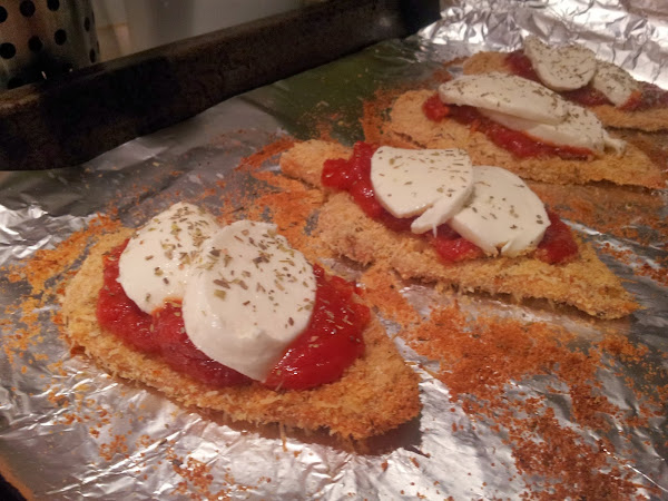 Una vez que estén bien dorados por fuera, echamos por encima un par de cucharadas de salsa de tomate, unas rodajas de mozzarella y espolvoreamos un poco de orégano. Volvemos a meter los filetes en el horno y dejamos unos 5 minutos más, hasta que se funda el queso.