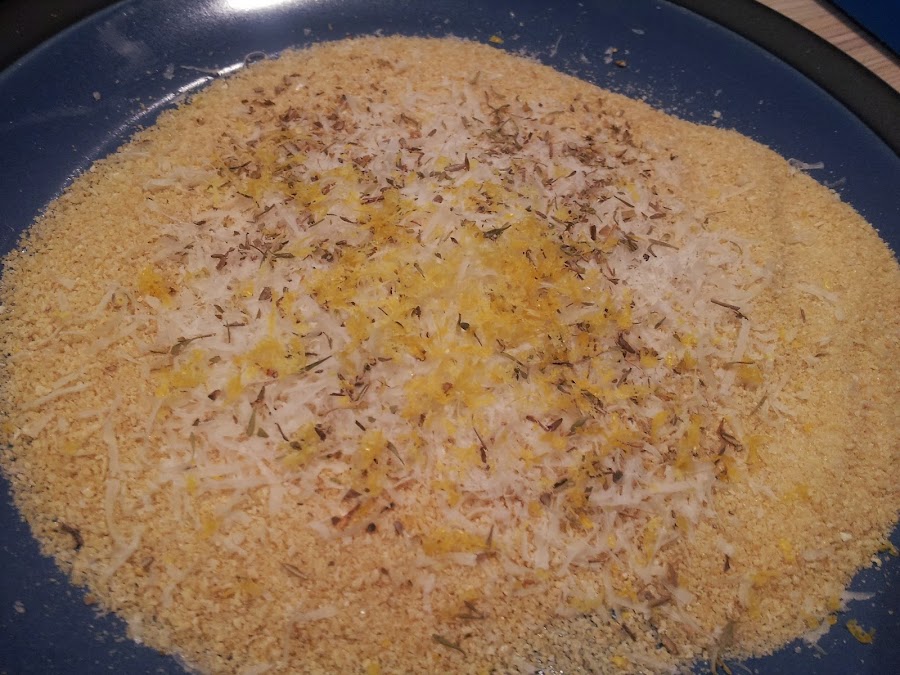 Para el empanado: En un plato colocamos el pan rallado y le rallamos por encima el queso parmesano. Le añadimos tomillo, orégano y la ralladura de un limón. Mezclamos bien y vamos pasando los filetes bien untados de aceite de oliva y empanamos por ambas caras.