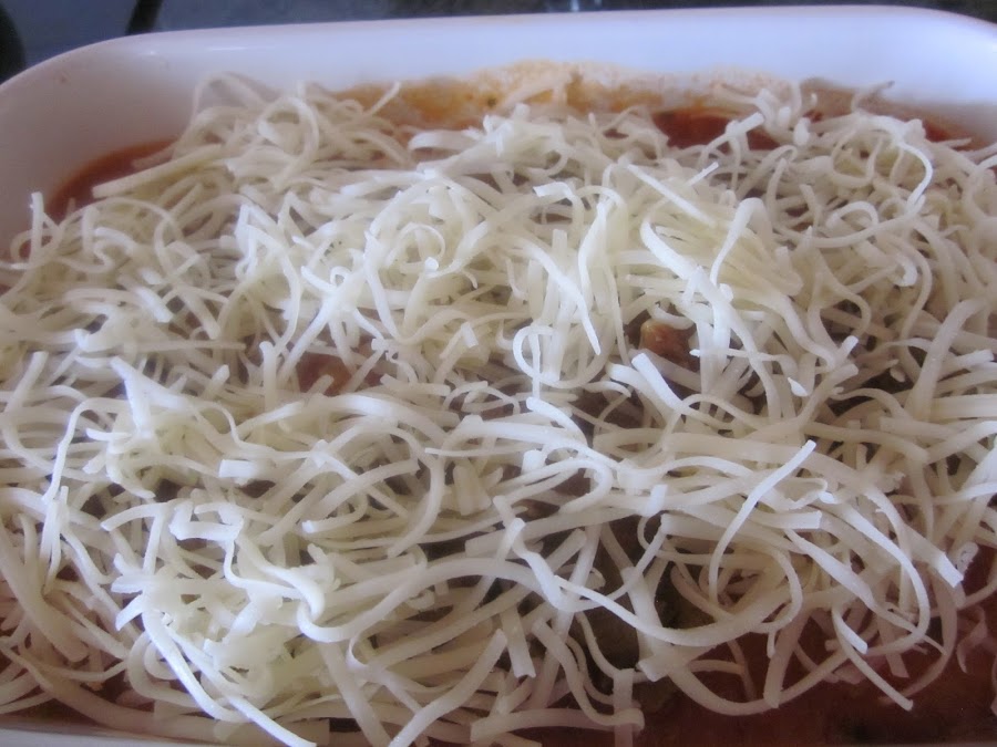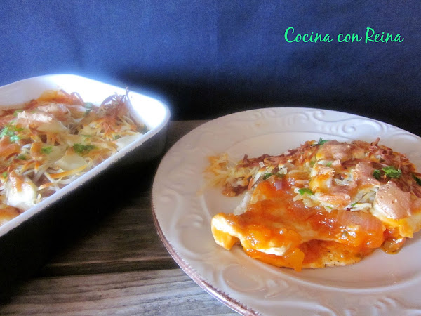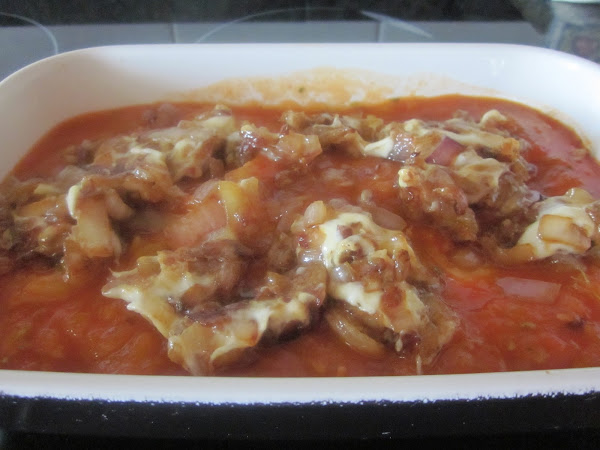 Cubrimos los filetes con la salsa de tomate, repartimos la cebolla con el queso por encima y terminamos cubriendo del resto del queso.