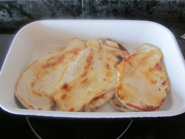 A continuación salpimentamos los filetes de pollo y los pasamos por la sartén, los vamos poniendo en una fuente apta para el horno.