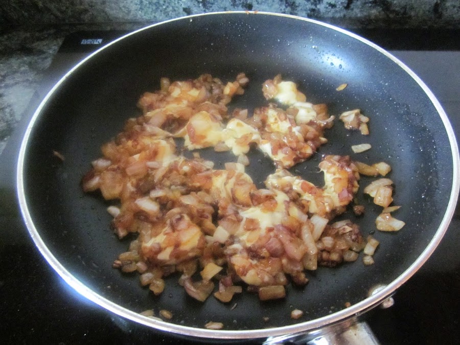 En la misma sartén donde hemos hecho el pollo, añadimos un poco de mas aceite , y sofreímos la cebolla y el diente de ajo, cuando esté pochado , añadimos 50 gr. de queso y hacemos una especia de masa.