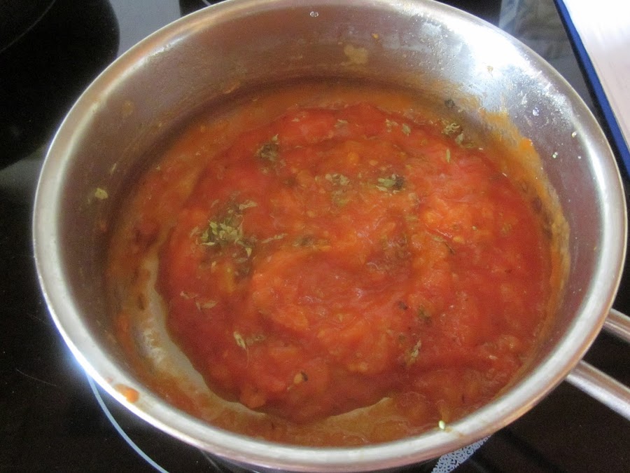 Pelamos y trituramos los tomates y los sofreímos con un poco de aceite, sal y pimienta, con 10 minutos es suficiente. Añadimos el orégano y reservamos.