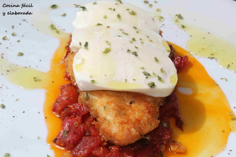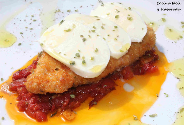 Repartimos la salsa en platos, ponemos una pechuga encima. Cortamos rodajas finas de mozarella y cubrimos la pechuga(con el calor se irá fundiendo). Un poco de aceite de oliva y una pizca más de orégano fresco.