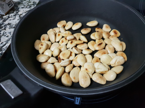 - Si tienes almendras tostadas, añadirlas a la cebolla. En mi caso tenía almendras crudas y las tuve que tostar.