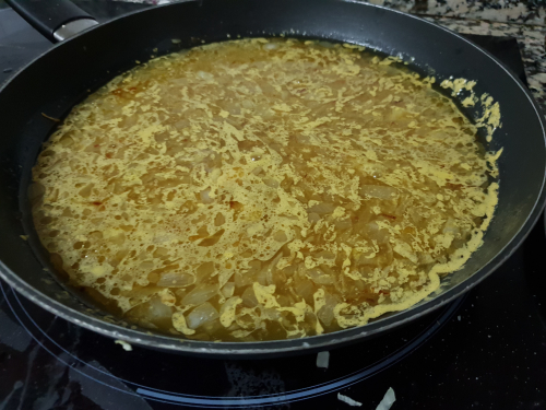 - Poner aceite en la misma sartén que se ha asado el pollo y calentarlo. Sofreír la cebolla durante 5 minutos.