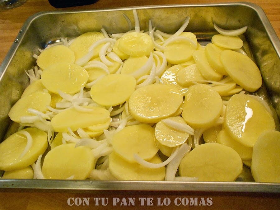 1. Cortamos la cebolla en juliana y las patatas en rodajas de 1/2 cm. Las disponemos en una fuente de horno con un poco de sal y un chorrito de aceite.