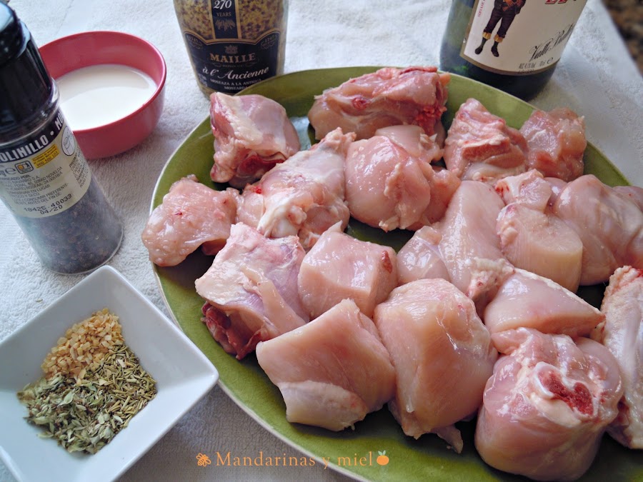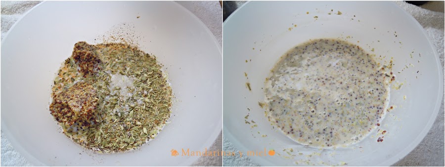 De mostaza puedes utilizar la que tengas, yo he puesto mostaza a la antigua porque me quedaba una poquita en la nevera.