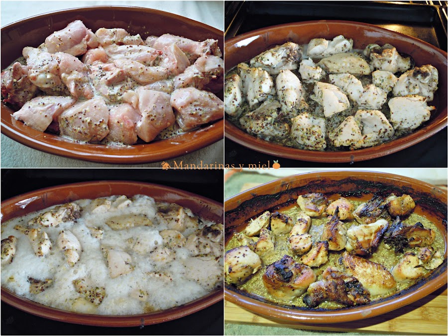 Salpimenta los trozos de pollo y colócalos en una fuente de horno, embadurna cada trozo con la mezcla, echa todo lo que te sobre por encima y remueve los trozos para que se impregnen bien de todos los ingredientes.