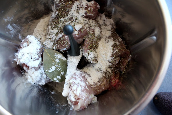 Colocamos la mariposa y añadimos el pollo, la sal, el tomillo, el romero, el orégano, el laurel, y la harina. Programamos: