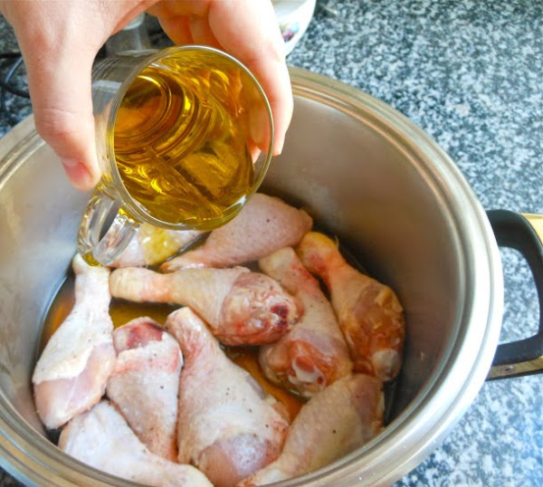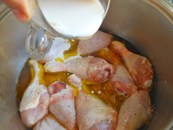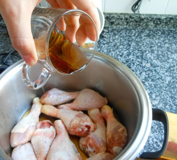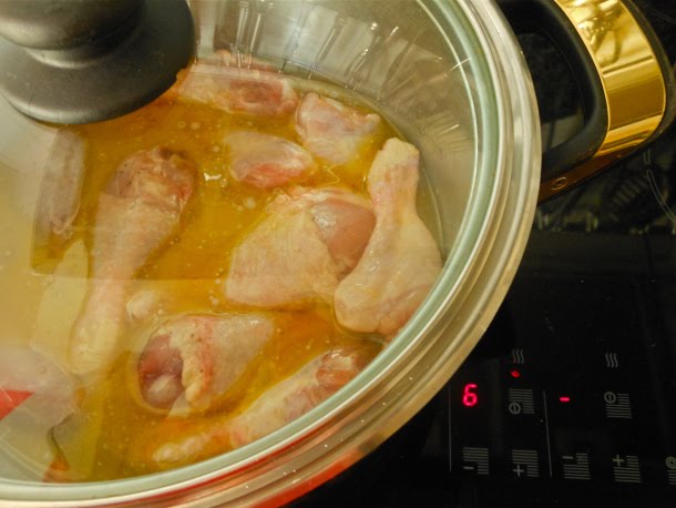 Después cuece los muslos de pollo a fuego medio, nº 6 de la placa vitrocerámica durante 30 minutos, con la cacerola tapada.