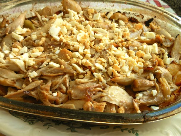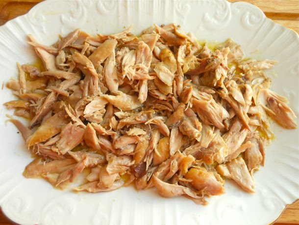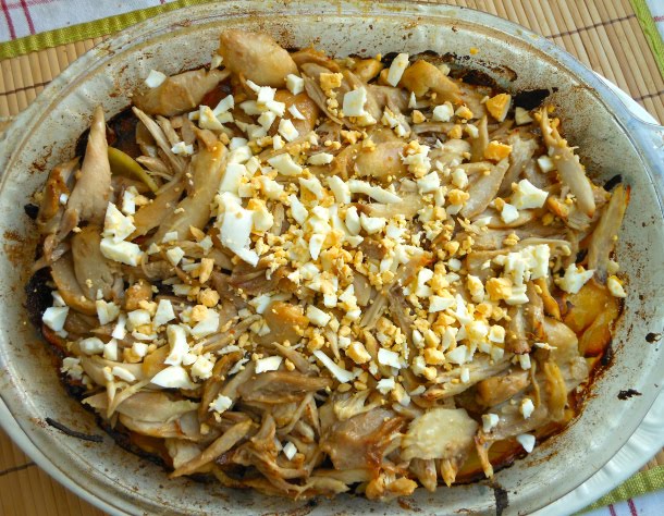 Una vez cocido los muslos de pollo por el método de las tres tazas, lo piqué y lo coloqué encima de las patatas panaderas junto con un poco del jugo de la cocción del pollo.