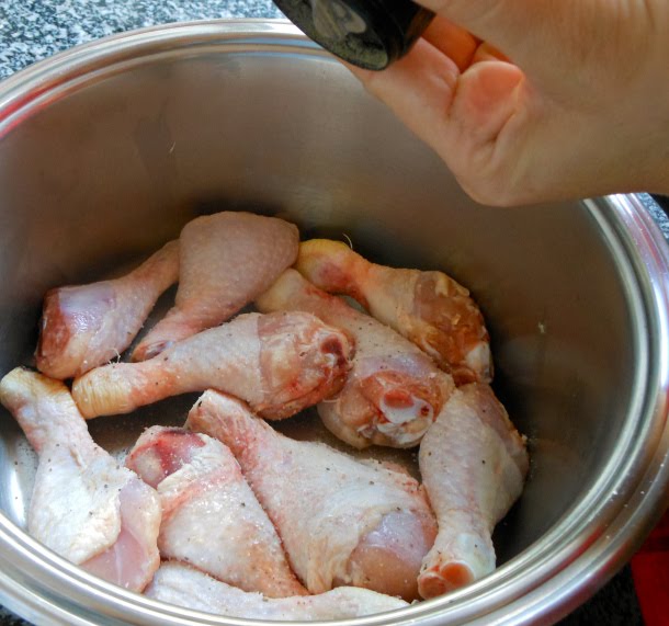 Comienza colocando los muslos de pollo en una cacerola y salpiméntalos generosamente con sal fina y pimienta negra recién molida.