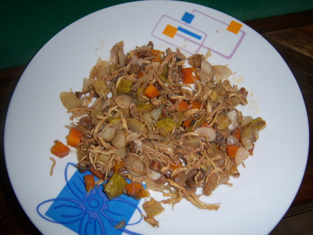 Incorporadas todas las verduras y las semillas agregar el pollo, luego el vinagre donde se habrá diluido el polvo de caldo de pollo y tapar por un momento para dejar q los jugos se mezclen y se absorban.