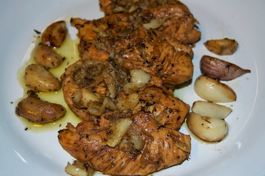 Sirve el pollo con la salsa de ajo por encima, adornado con perejil y con los ajos que habrás reservado enteros.