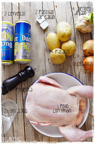 Pochamos la cebolla y el ajo abundantemente. Añadimos el pollo en trozos y doramos. Agregamos las pastillas de caldo y las patatas. Por último la cerveza junto con el agua y dejamos cocinar todo a fuego bajo durante al menos un par de horas
