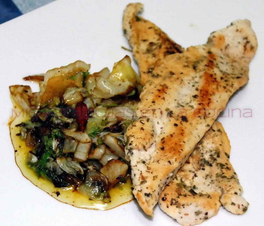 En un recipiente adecuado, dispondremos una capa de filetes de pollo que salpimentaremos y espolvearemos con las hierbas aromáticas; encima pondremos otra capa de filetes y repetiremos la operación hasta que tengamos todos los filetes. Le añadiremos el zumo de un limón y un chorrito de fino cubriendo con papel film de forma de no le entre aire, dejando reposar en frío media hora como mínimo. Ni que decir tiene que podéis elegir los condimentos a vuestro gusto.