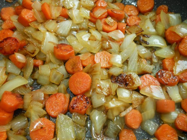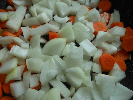 Cuando el aceite esté caliente introduce la cebolla y las zanahorias troceadas en la sartén junto a una poquita de sal fina y sofríelas durante 10 minutos aproximadamente. Las hortalizas deben quedar "al dente".