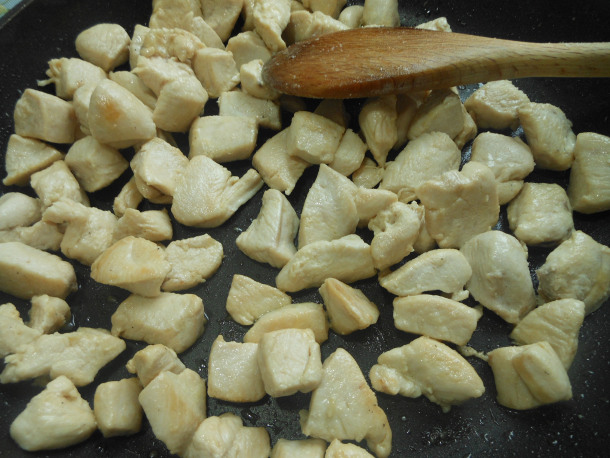 Tras esto trocea las pechugas de pollo en dados y saltéalos durante 3-4 minutos en la misma sartén donde hiciste las hortalizas. Cuando estén hechas sazónalas con sal fina al gusto.