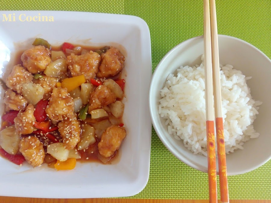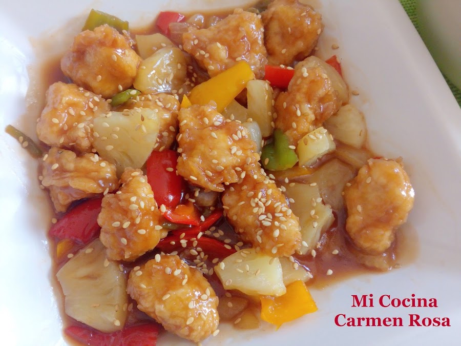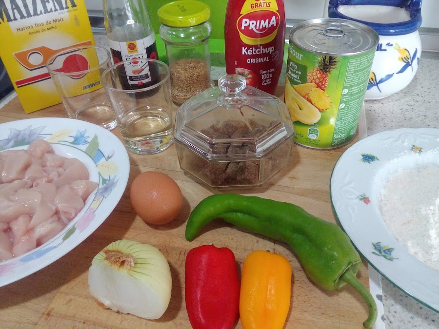 Para la salsa: Una cucharada de almidón de maíz (Maicena), seis cucharadas soperas de 50 ml. de vino blanco, 20 ml. de salsa de soja, 20 grms. de kétchup, 20 grms. de azúcar moreno, dos cucharadas soperas de vinagre blanco, el jugo de la piña en conserva.