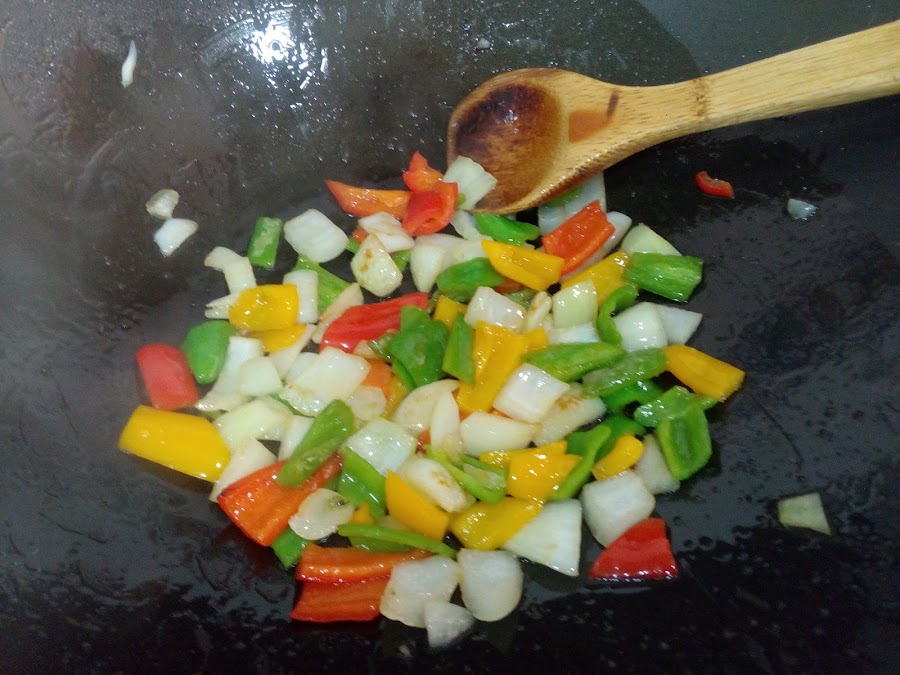 En un wok o sartén, echar un chorreoncito de aceite de oliva, cuando éste bien caliente incorporar los trozos de pimientos y cebolla salteándolos durante medio minuto aproximadamente, con cuidado de que no se lleguen a quemar.