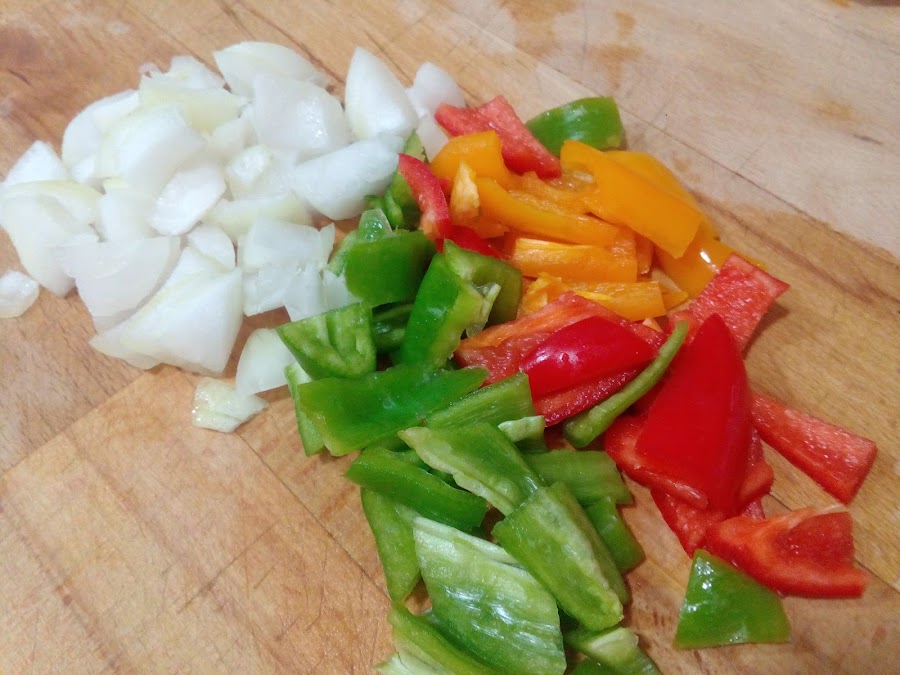 Lavar los pimientos y cortarlos en trozos pequeños junto con la cebolla.