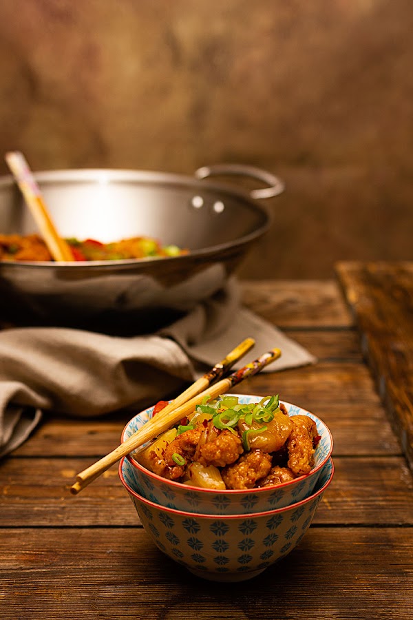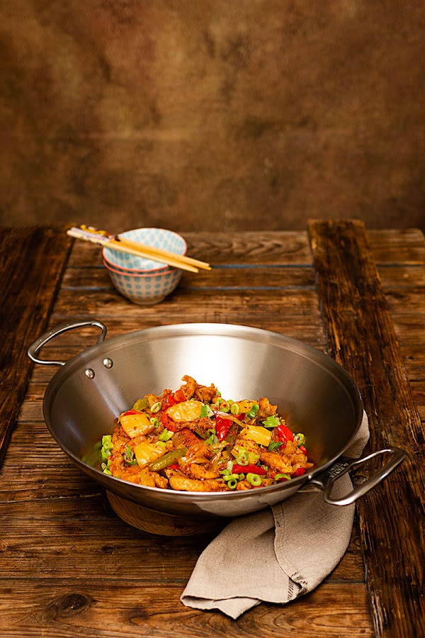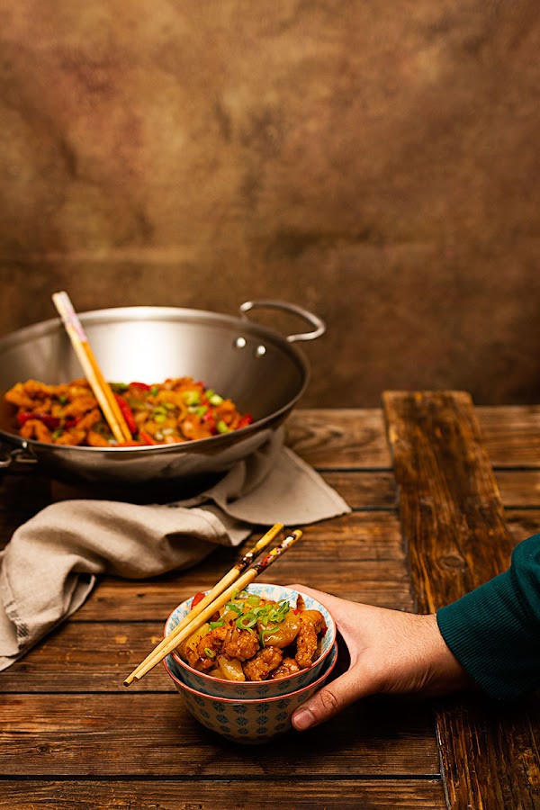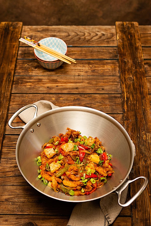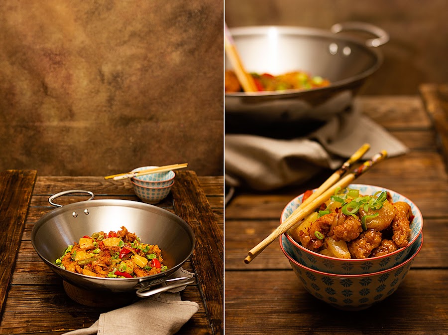 En esta ocasión he substituido parte del vinagre de arroz por el jugo de la piña y como siempre que preparo éste tipo de elaboraciones me encanta terminarla con un poco de chili en polvo y cebolleta china para decorar y dar ese toque picante que tanto gusta en casa.