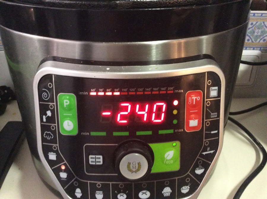 Cuando termine, sacamos el pollo de la cubeta, y a la salsa le añadimos la maizena disuelta en un poquito de agua. Programamos menú lento 110º sin la tapa hasta que veamos que la salsa espesa.