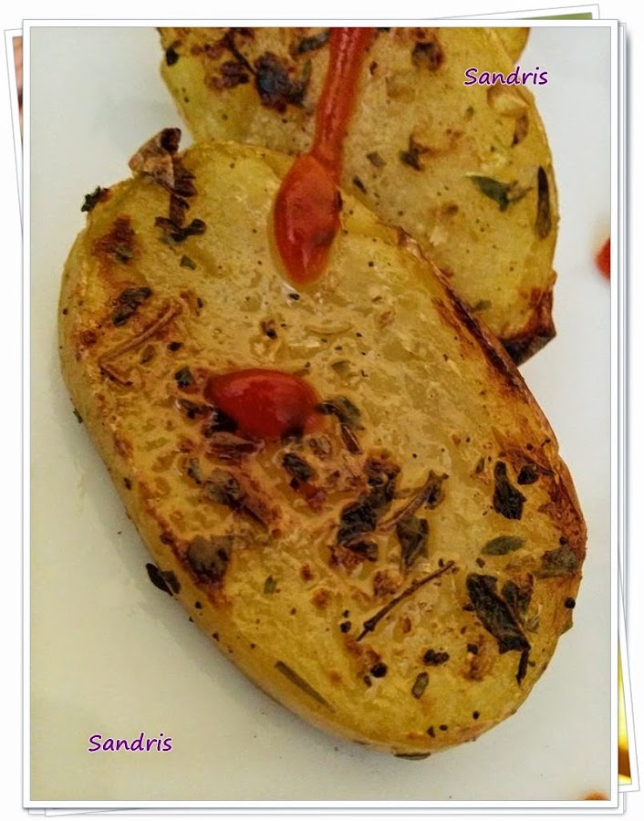 Y listo para comer, con un rico sabor a ajo y mostaza y un puntito de limón. Rico rico!!! Para acompañar, hice unas patatas a la plancha con unas gotitas de aceite, orégano y pimienta negra. Para cuando vayamos a emplatar, reservamos un poco del aceite que ha sobrado de los muslos y lo ponemos por encima de las patatas para que también tenga un poco de saborcito.
