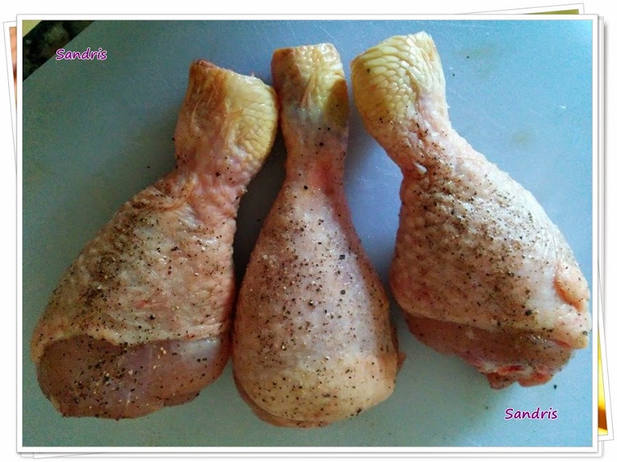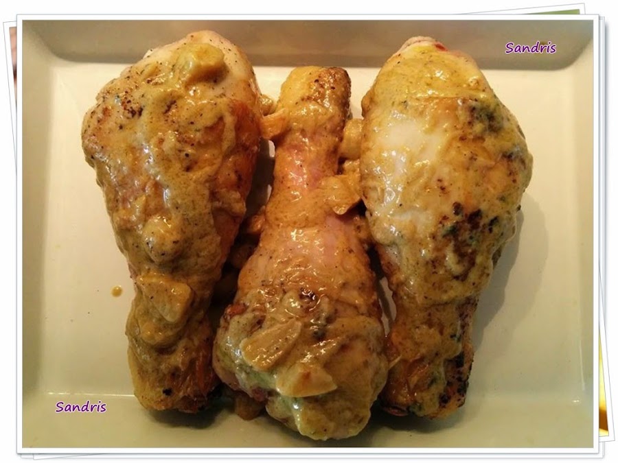 Luego marcamos un poco los muslos de pollo en la sarten y los pasamos a la fuente para el horno una vez estén ya dorados. Antes de meterlos al horno, los untamos bien con la salsita que nos ha salido de los ajos; reservamos un poco de salsa para cuando les demos la vuelta a los muslos, poder untarles un poco más por el otro lado. Y nada más, metemos al horno precalentado durante una media hora (dependiendo del horno); yo los puse a 200ºC.