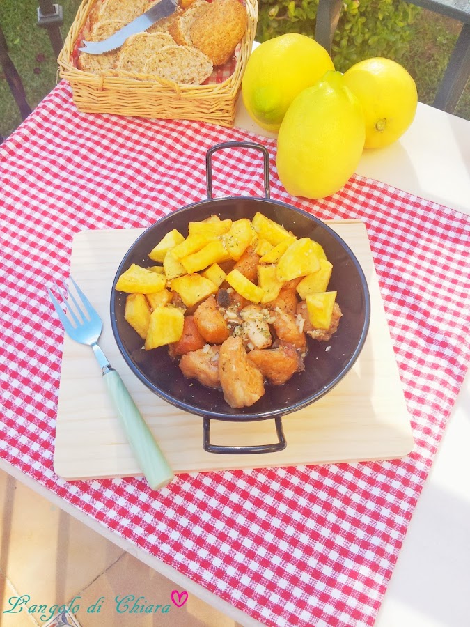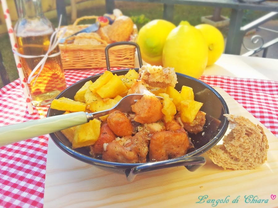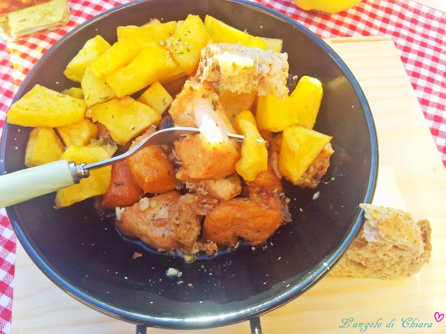 Para hacer las patatas sólo tenemos que lavarlas, cortarlas en daditos, sazonar y freír en abundante aceite. Al servirlas podéis echar un poco de orégano para dar más sabor.