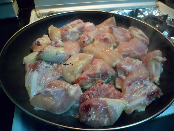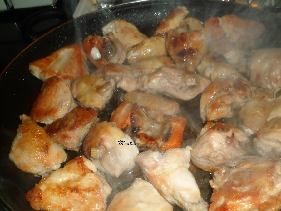 En una cazuela echaremos aceite, mas o menos que cubra el fondo y echaremos el pollo para que se dore.