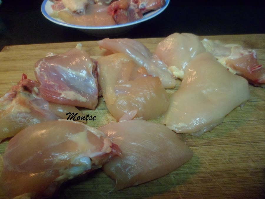 Cortaremos el pollo a trozos y echaremos sal y pimienta.